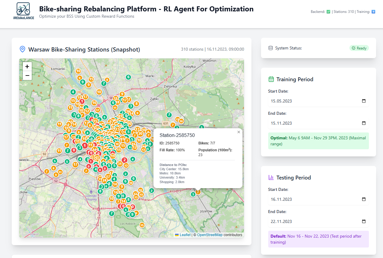 Druga publikacja - SoftwareX: iREbikeLANCE - platforma RL do decyzji relokacyjnych - koncentruje się na etapie decyzyjnym, tj. jak przekształcić prognozy i dane historyczne w działania operacyjne. Mjr dr iż. Igor BETKIER z WIG opracował i zaprogramował otwarte środowisko uczenia ze wzmocnieniem (RL - Reinforcement Learning) iREbikeLANCE, w którym agent planuje relokacje rowerów (skąd, dokąd, ile) tak, aby zwiększyć dostępność dla użytkowników przy kontrolowanych kosztach logistycznych. Rdzeniem rozwiązania jest algorytm PPO, wybrany ze względu na stabilność i efektywność w zadaniach dyskretnych. Środowisko symulacyjne odzwierciedla kluczowe elementy systemu: pojemności stacji, zmienny popyt, wpływ pogody oraz koszty przejazdów między lokalizacjami.