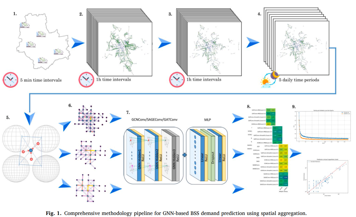 Zastosowane grafowe sieci neuronowe (m.in. GCN, GAT) korzystają z cech czasowych (pora dnia, dzień tygodnia), meteorologicznych (temperatura, opady, wiatr, wilgotność) i przestrzennych (gęstość zaludnienia, odległości do metra, przystanków, szkół, parków, centrów handlowych). Autorzy porównują warianty architektury i rozmiar siatki, pokazując kompromis między rozdzielczością lokalną a stabilnością wniosków globalnych: większe kwadraty lepiej wspierają planowanie strategiczne (lokalizacja nowych stacji, pojemności), mniejsze są użyteczne operacyjnie (przygotowanie do szczytów, krótkoterminowe uzupełnianie floty).