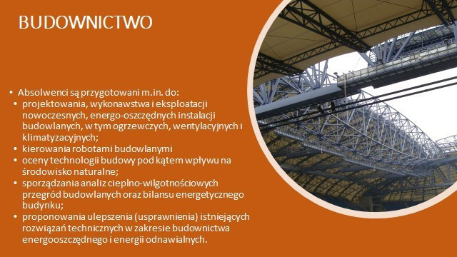 W programie studiów znajdują się zagadnienia związane z nowoczesnymi rozwiązaniami budownictwa energooszczędnego, projektowaniem obiektów budowlanych kubaturowych z zastosowaniem technologii BIM, ochroną środowiska naturalnego, wykorzystaniem odnawialnych źródeł energii, eksploatacją i wyposażaniem budynków w nowoczesne instalacje umożliwiające minimalizację zużycia energii i wpływu na środowisko naturalne. W programie studiów znajdują się również przedmioty, które przygotowują absolwenta do projektowania, wykonawstwa i eksploatacji obiektów budowlanych kubaturowych, wykonywania projektów napraw, renowacji, remontów, diagnostyki konstrukcji, audytów energetycznych, zabezpieczania budynków z uwagi na przepisy przeciwpożarowe z wykorzystaniem oprogramowania inżynierskiego.